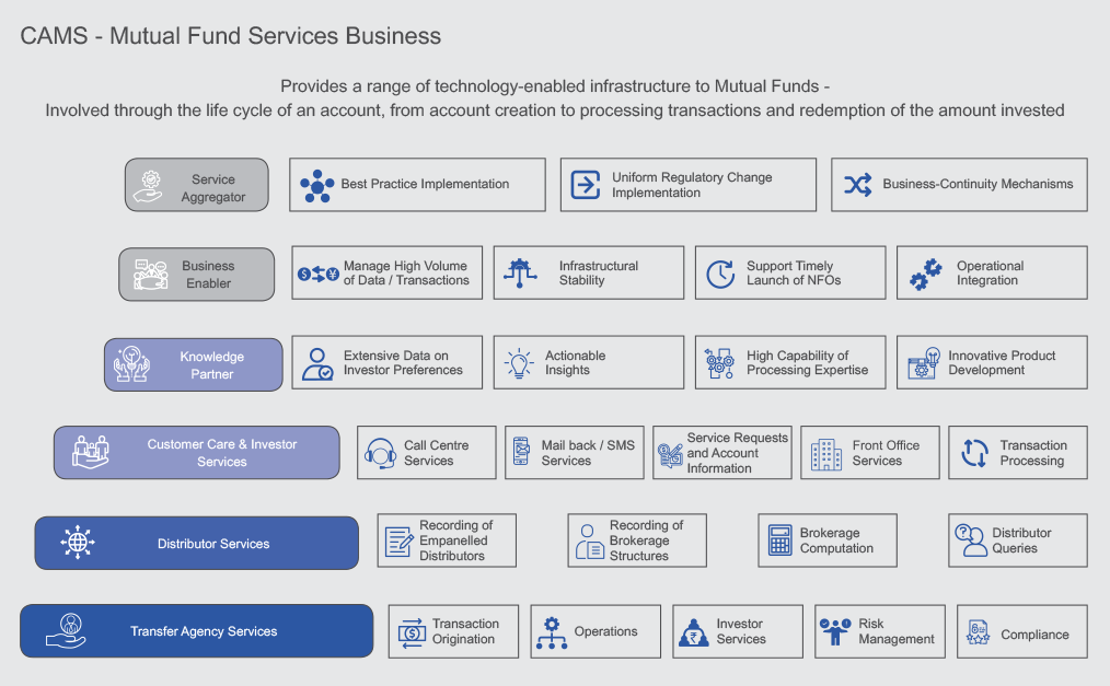 With the initiative of creating an end-to-end value chain of services, we have grown our service offerings and currently provide a comprehensive portfolio of technology-based services, such as transaction origination interface, transaction execution, payment, settlement and reconciliation, dividend processing, investor interface, record keeping, report generation, intermediary empanelment and brokerage computation and compliance-related services, to our Mutual Fund clients, their distributors and investors.